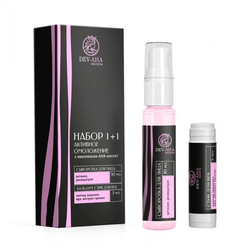 Набор «Активное омоложение» DEV-AHA с ретинолом, ресвератроломи АНА-кислотами — это комплексный уход нового поколения для зрелойи нуждающейся в восстановлении кожи. Дуэт сыворотки и стика для век активизирует природные процессы омоложения, сокращает выраженность морщин и наполняет кожу жизненной энергией. Сыворотка для лица с ретинолом, ресвератролом и АНА-кислотами —это омоложение на клеточном уровне, в ее основе мощные антивозрастные компоненты. Ретинол и ресвератрол стимулируют выработку коллагена, ускоряют обновление клеток и борются с признаками старения. Гиалуроновая, винная и яблочная кислоты глубоко увлажняют, возвращая коже упругость и гладкость. Настои бессмертника и шиповника, а также экстракты арганы и виноградной косточки насыщают кожу антиоксидантами, питаюти укрепляют. Формула на основе натуральных экстрактов и настоев обеспечивает мягкое, но мощное действие.