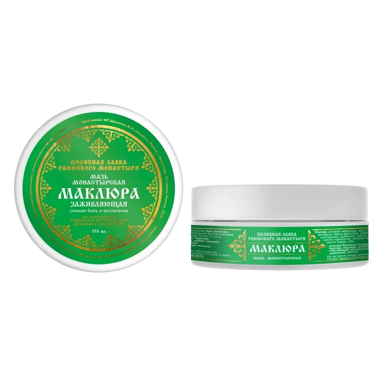 В основе монастырской мази экстракт маклюры, используемый в народной медицине при вывихах, растяжениях, ушибах, при любых доброкачественных образованиях 〈мастопатии, фиброаденоме, узловых и кистозных образованиях, жировиках〉. Активные компоненты мази помогают при болях в спине, суставных зажимах, симптомах артрита и артроза, бурсита, остеохондроза, радикулита и ревматизма, снимают отёчность и болевые ощущения, в том числе при геморрое, трещинах заднего прохода, помогают при кожных