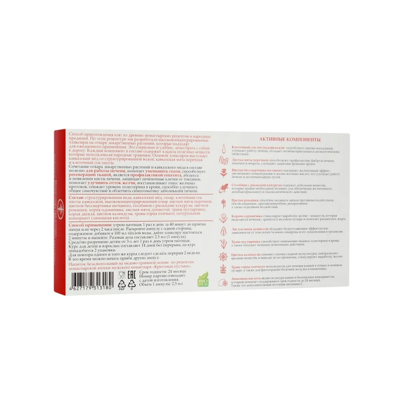 Состав: структурированная вода, кавказский мёд, сахар, клеточный сок пихты кавказской, высококонцентрированный отвар листьев мяты перечной, цветков бессмертника песчаного, столбиков с рыльцами кукурузы, цветков ромашки, корня одуванчика, листья мяты душистой, травы пустырника, корня дягиля, цветков календулы, травы горца птичьего, натуральный консервант 〈лимонная кислота〉.